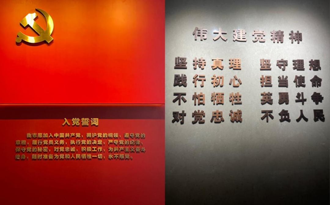 紀(jì)念館外,宣誓墻氣勢恢宏,黨旗浮雕嵌在中央,入黨誓詞刻在一側(cè)。黨員站在黨旗前列隊舉拳,再次宣誓,堅定初心和使命,增強(qiáng)黨性意識,永葆共產(chǎn)黨人的政治本色。