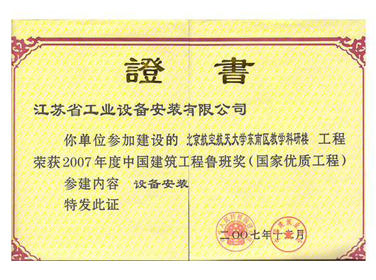北京航空航天大學東南區教學科研樓工程建筑面積廣,構造復雜,是江蘇省安在北京地區的又一標志性工程,獲得2007年度“魯班獎”。