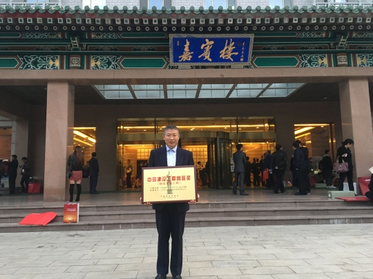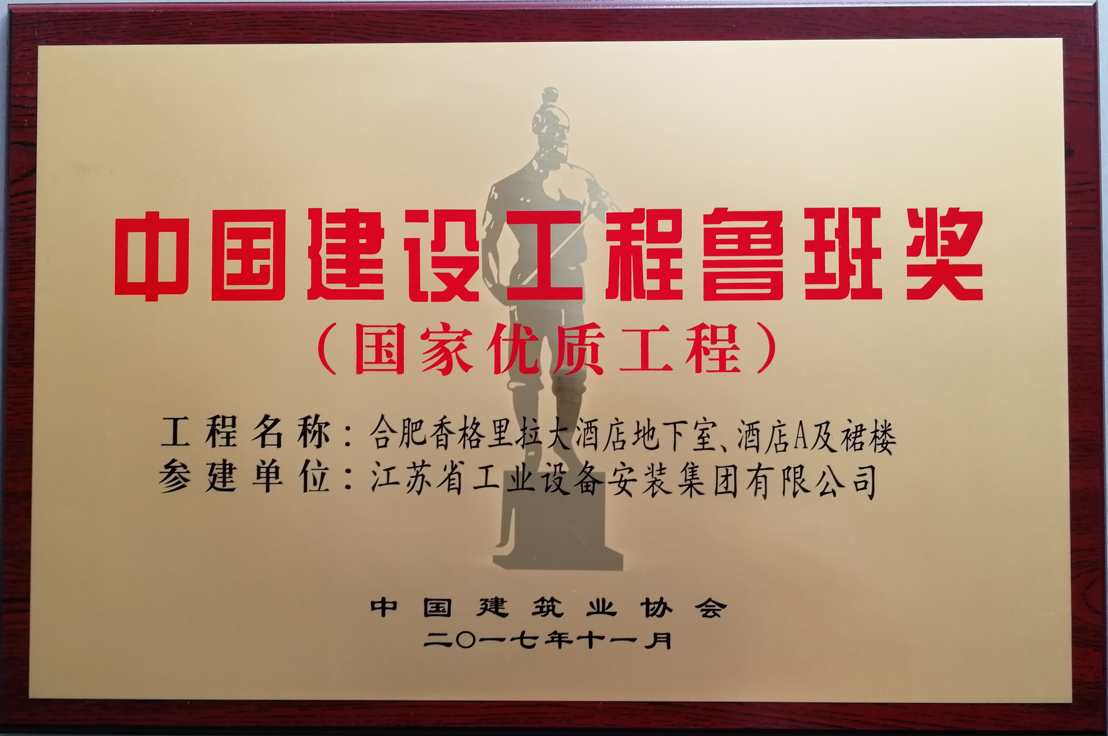 2017年11月6日,中國建筑業的盛會——紀念魯班獎創立30周年暨2016~2017年度創精品工程經驗交流會在北京釣魚臺國賓館召開。江蘇省安參建的合肥香格里拉大酒店工程榮獲中國建設工程魯班獎(國家優質工程),這是江蘇省安第9次獲此殊榮!公司總工程師馬記和項目部代表陳軍代表江蘇省安上臺領獎。