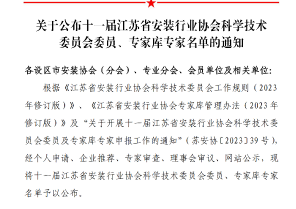 江蘇省安裝行業協會公布了十一屆江蘇省安裝行業協會科學技術委員會委員、專家庫專家名單,我司多名人員榜上有名。