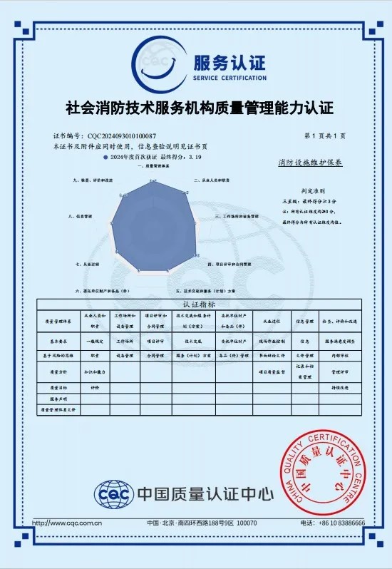 今年,我司成功通過“消防技術服務機構質量管理能力認證”,該項認證標志著省安在消防設施維護保養工程領域的專業程度和質量管理能力達到了新的高度。