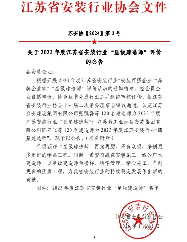 今年,江蘇省安裝行業協會公布了2023安裝百強企業和2023星級建造師名單,我司榮獲“2023安裝百強企業”稱號;陳亞飛,王振興,鄭曉勇榮獲“2023四星建筑師”稱號