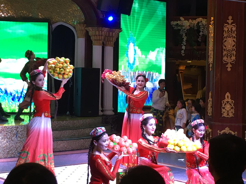 酒店的餐廳和飲食頗有特色,每天吸引了眾多食客來此用餐。給我印象深刻的是,在這里入住,不僅可以品嘗正宗的新疆美食,還能免費欣賞到充滿民族風情的歌舞表演。維吾爾族能歌善舞,維族美女婀娜多姿,的確名不虛傳。頭戴小花帽的男主持人語言幽默,擅長與客人互動,在感染力極強的維族音樂聲中,常能激發客人的跳舞欲望,再與維族演員手拉手共舞,現場氣氛掀起陣陣高潮。